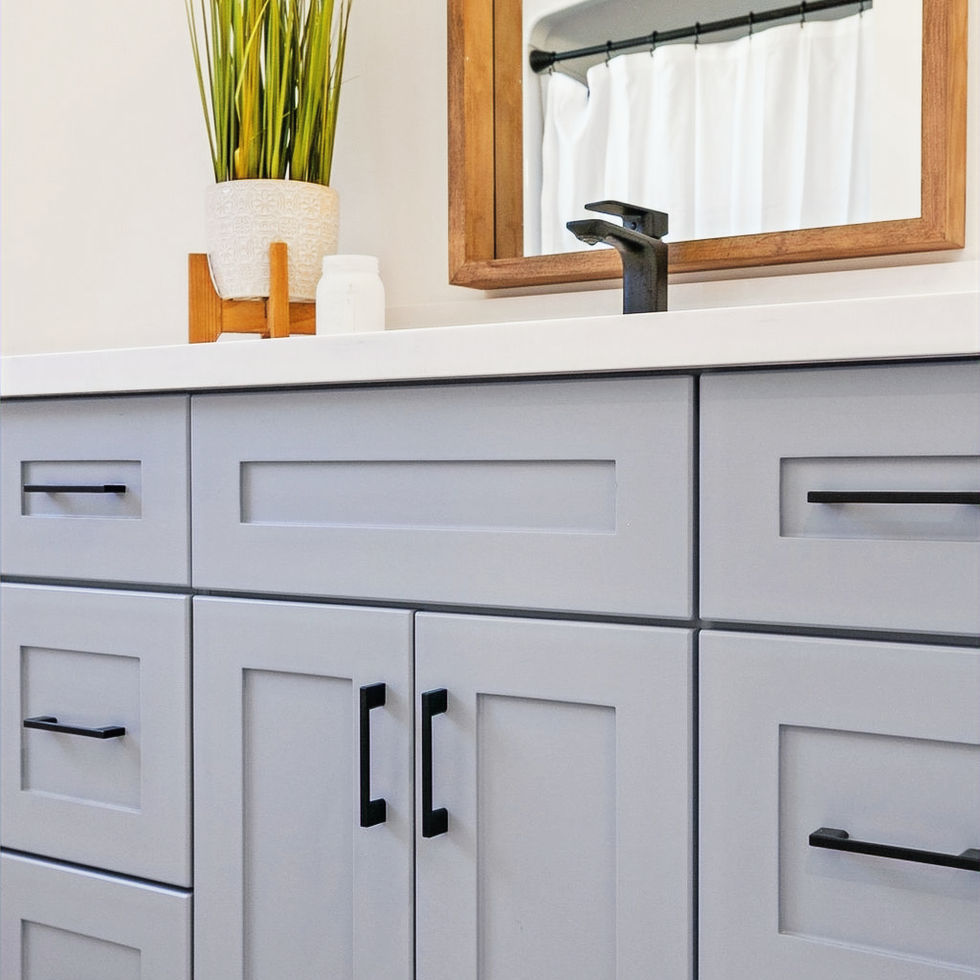 Project Cartwright delivers a fresh, modern aesthetic with bold contrast and clean lines. The design features a striking mix of white perimeter cabinets and deep charcoal or navy lowers, paired with sleek brass and matte black hardware. Natural wood accents and open shelving add warmth and softness to the crisp palette. Overall, the space feels tailored, contemporary, and full of personality.